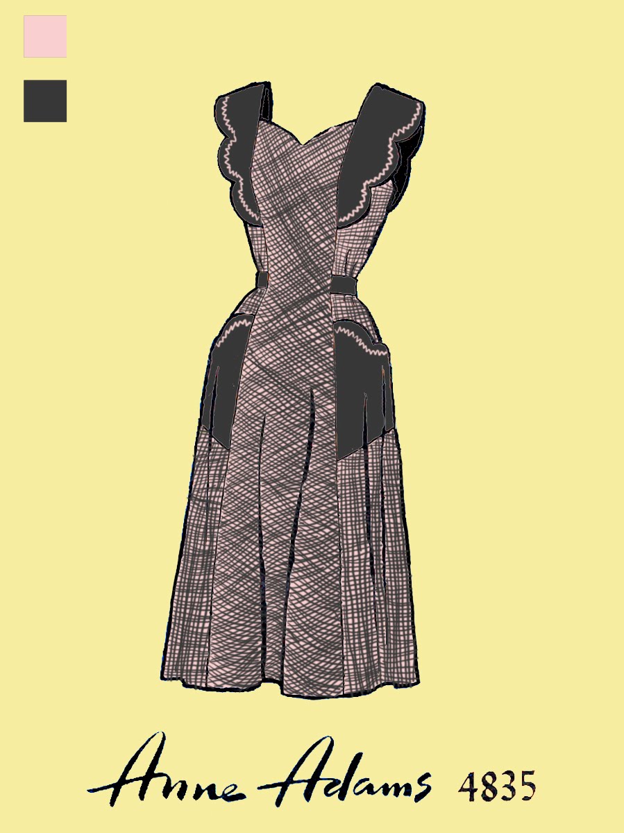 Please pardon my incredibly lame attempt at representing gingham. I'm sure Photoshop would do crosshatching for me, but I haven't figured it out yet.I swore I'd never work in cotton-polyester again, but I might make an exception for this since I can't get out of my head that it wants to be pink and charcoal. I think, too, that I shouldn't make it too bright since the design is so doll-like on its own.